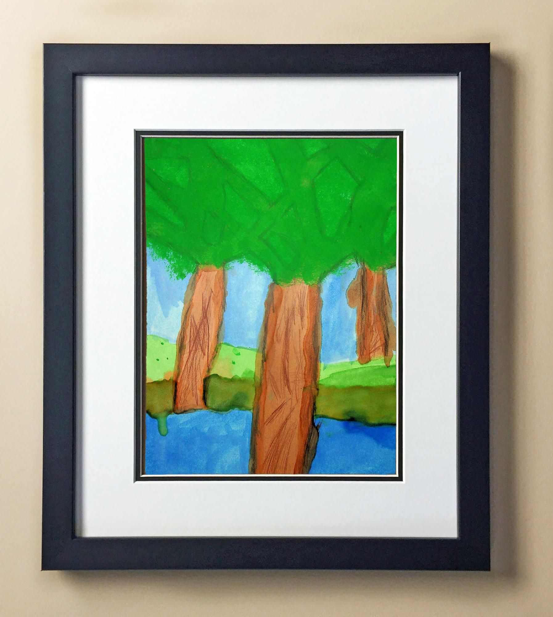 Included with the purchase is the Students Artwork, Frame, double matboard, shatter proof plexiglass, and a ready to hang backerboard with turnbuttons