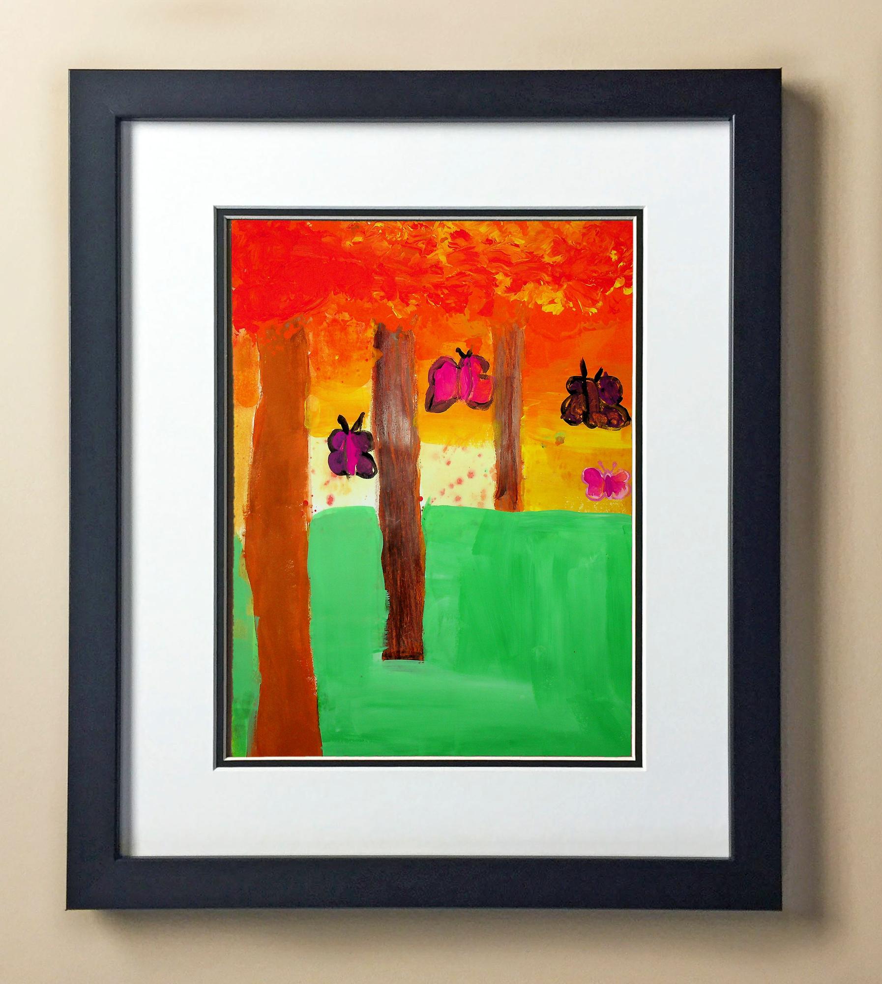 Included with the purchase is the Students Artwork, Frame, double matboard, shatter proof plexiglass, and a ready to hang backerboard with turnbuttons