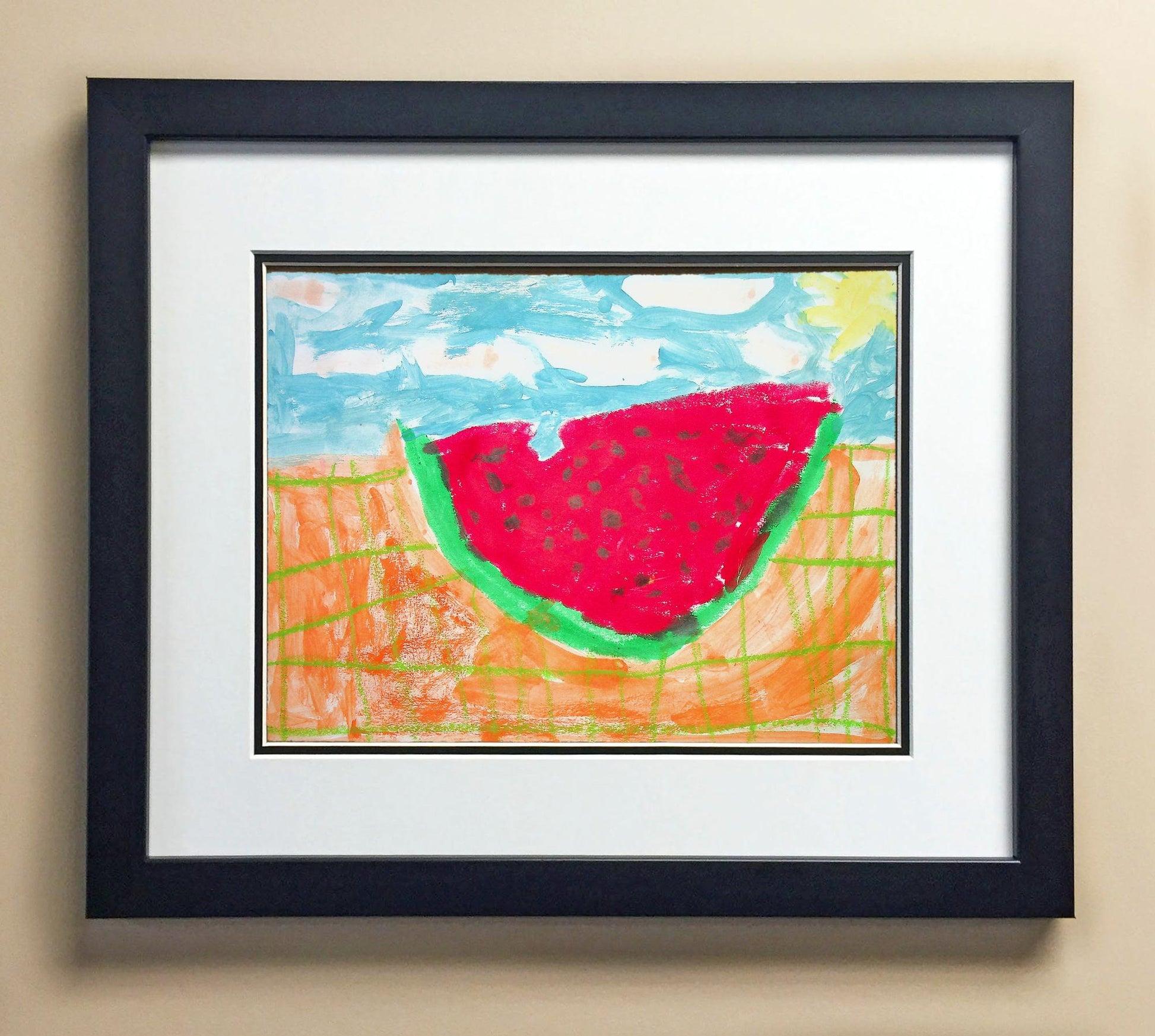 Included with the purchase is the Students Artwork, Frame, double matboard, shatter proof plexiglass, and a ready to hang backerboard with turnbuttons