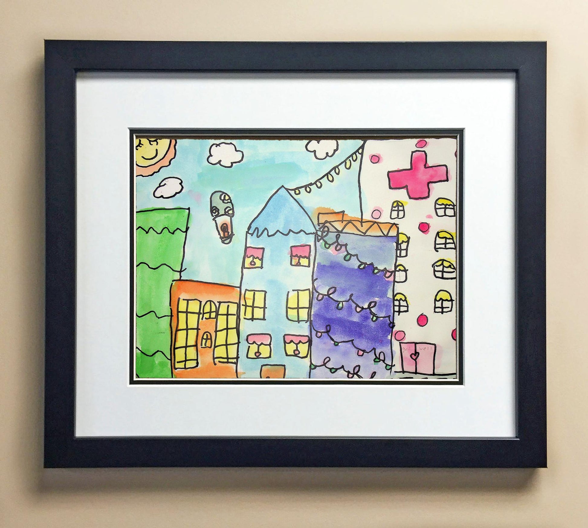 Included with the purchase is the Students Artwork, Frame, double matboard, shatter proof plexiglass, and a ready to hang backerboard with turnbuttons