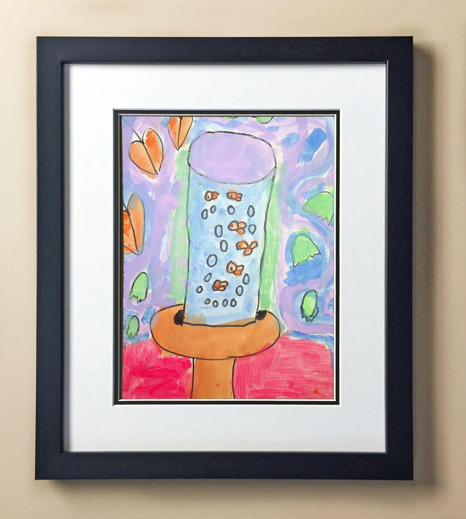 Included with the purchase is the Students Artwork, Frame, double matboard, shatter proof plexiglass, and a ready to hang backerboard with turnbuttons