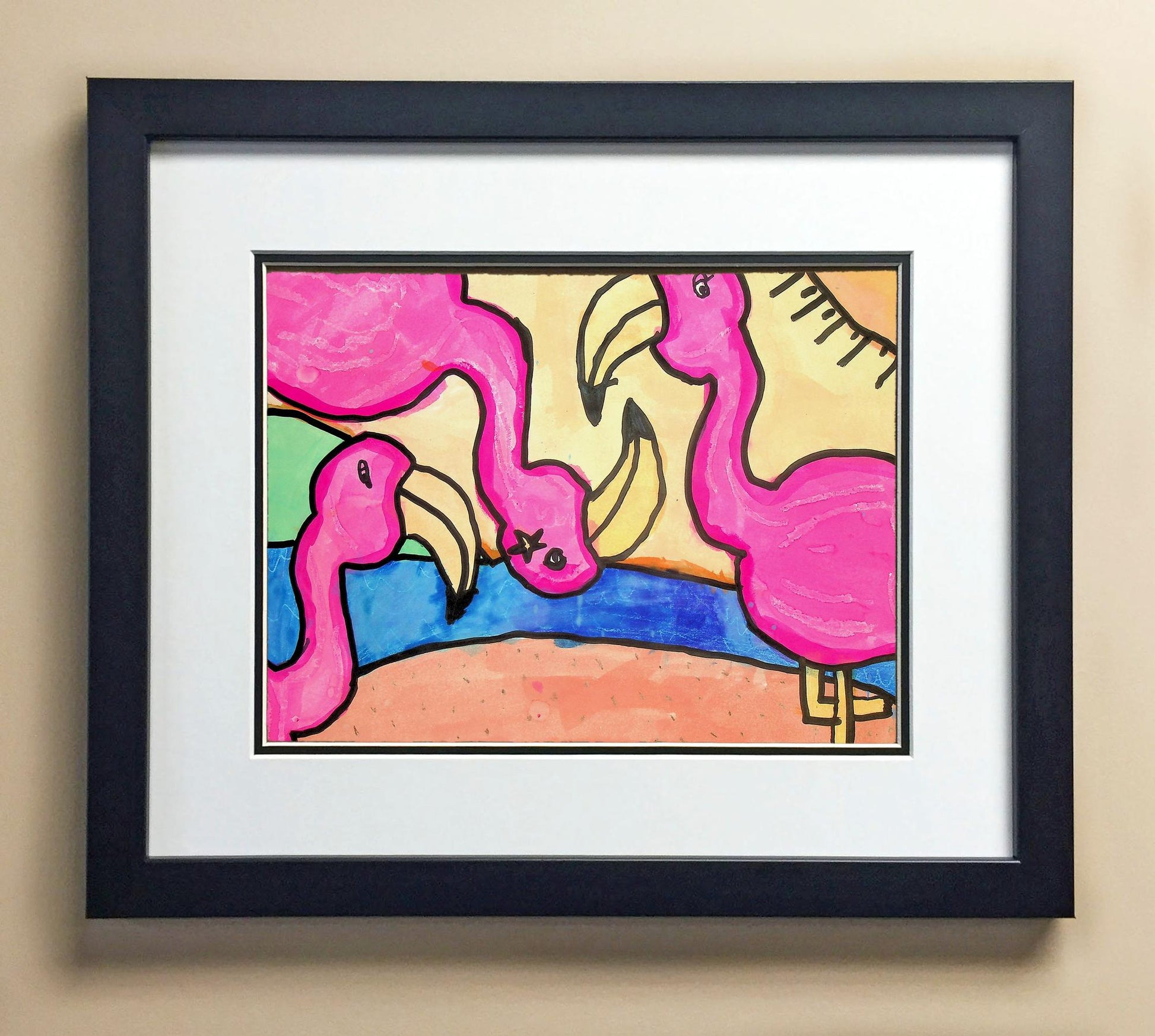 Included with the purchase is the Students Artwork, Frame, double matboard, shatter proof plexiglass, and a ready to hang backerboard with turnbuttons