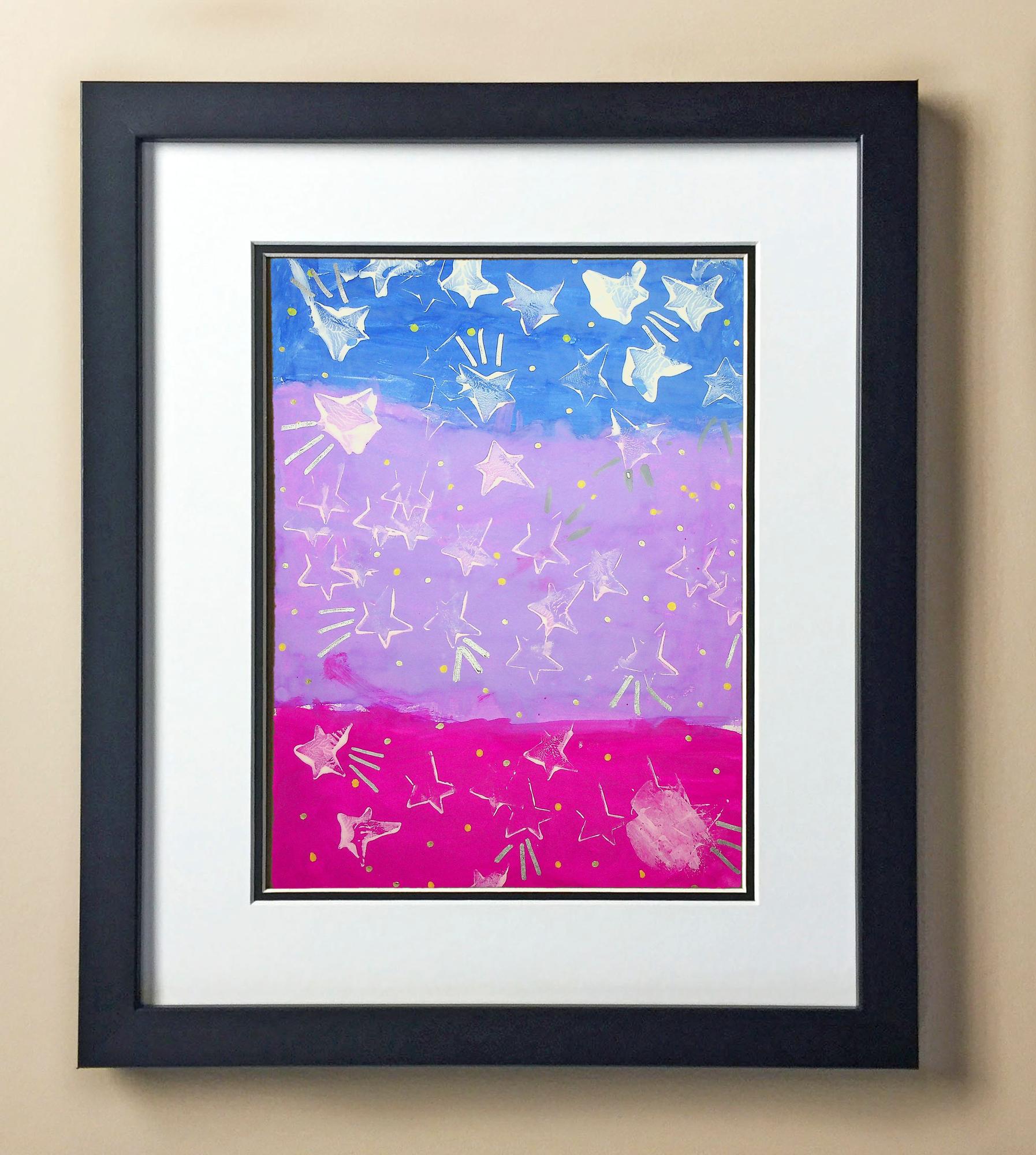 Included with the purchase is the Students Artwork, Frame, double matboard, shatter proof plexiglass, and a ready to hang backerboard with turnbuttons