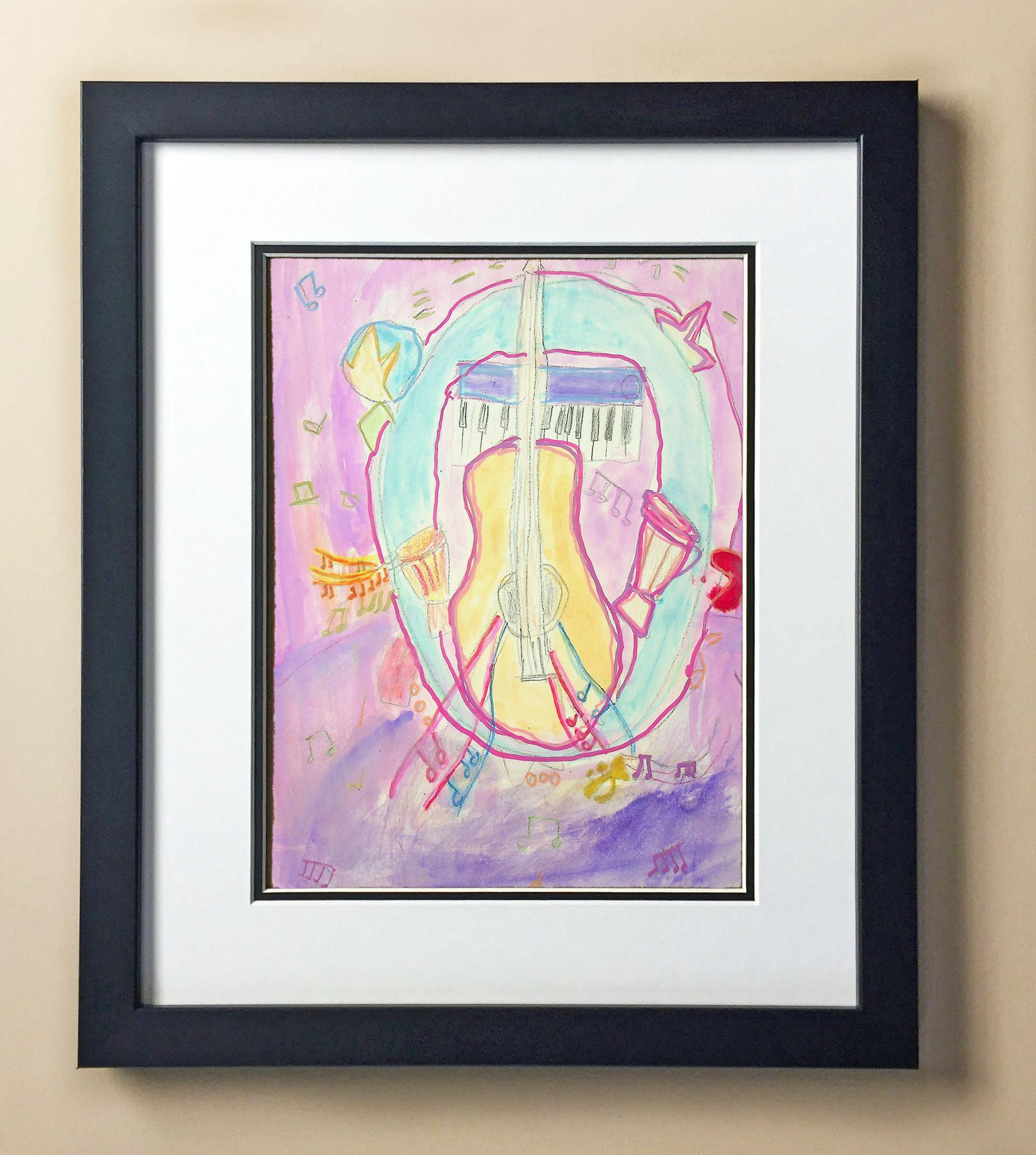 Included with the purchase is the Students Artwork, Frame, double matboard, shatter proof plexiglass, and a ready to hang backerboard with turnbuttons