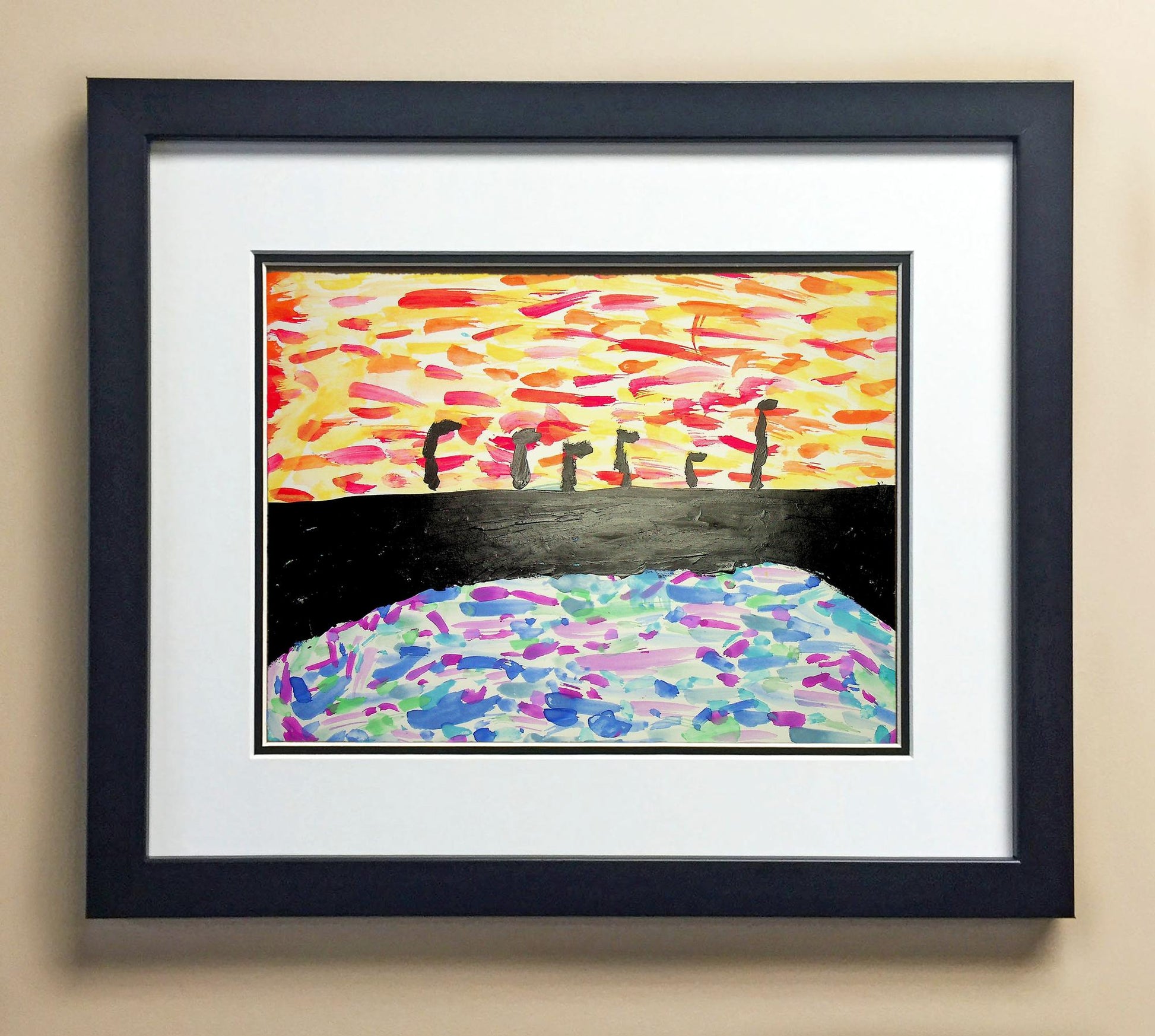 Included with the purchase is the Students Artwork, Frame, double matboard, shatter proof plexiglass, and a ready to hang backerboard with turnbuttons