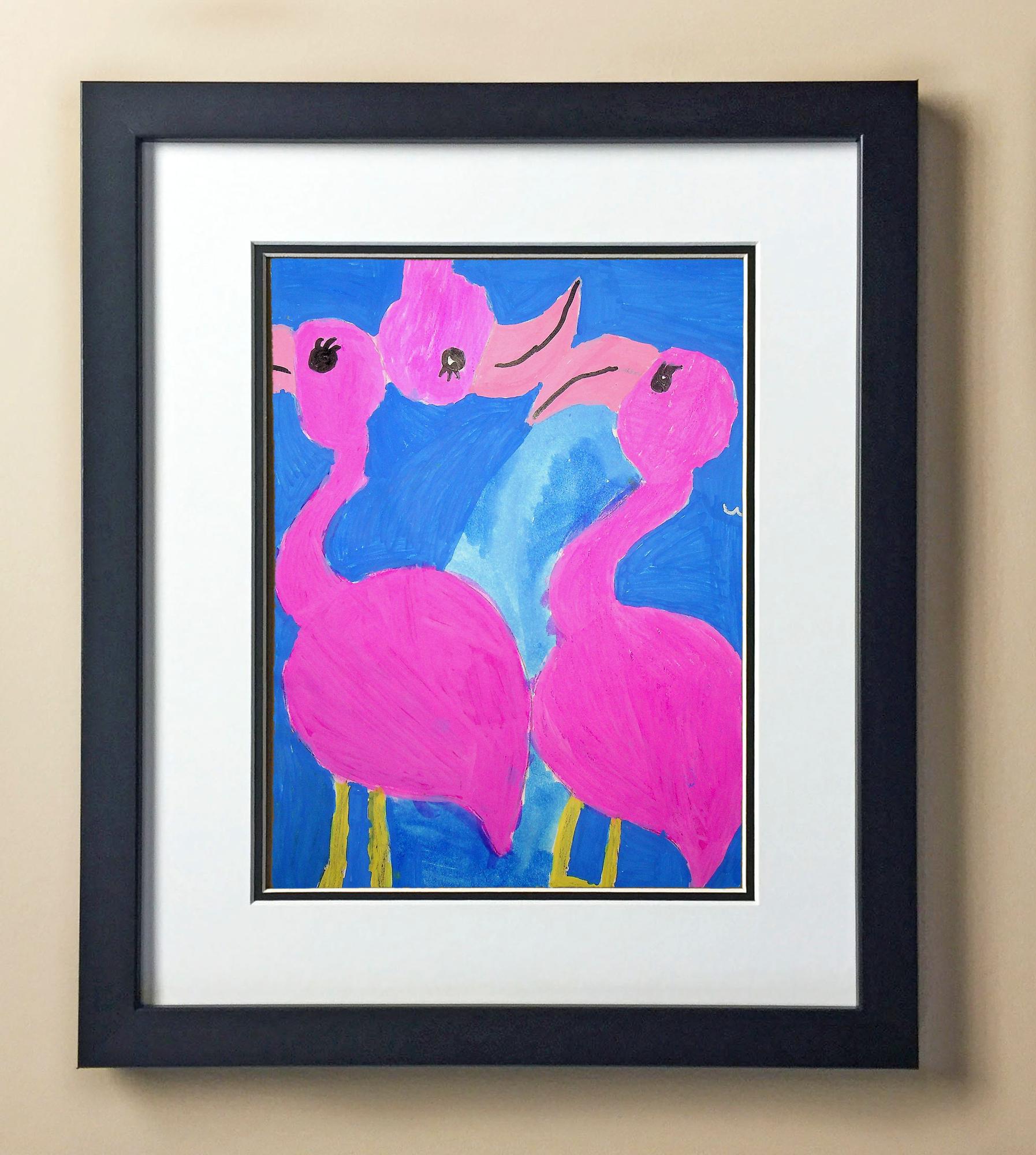Included with the purchase is the Students Artwork, Frame, double matboard, shatter proof plexiglass, and a ready to hang backerboard with turnbuttons