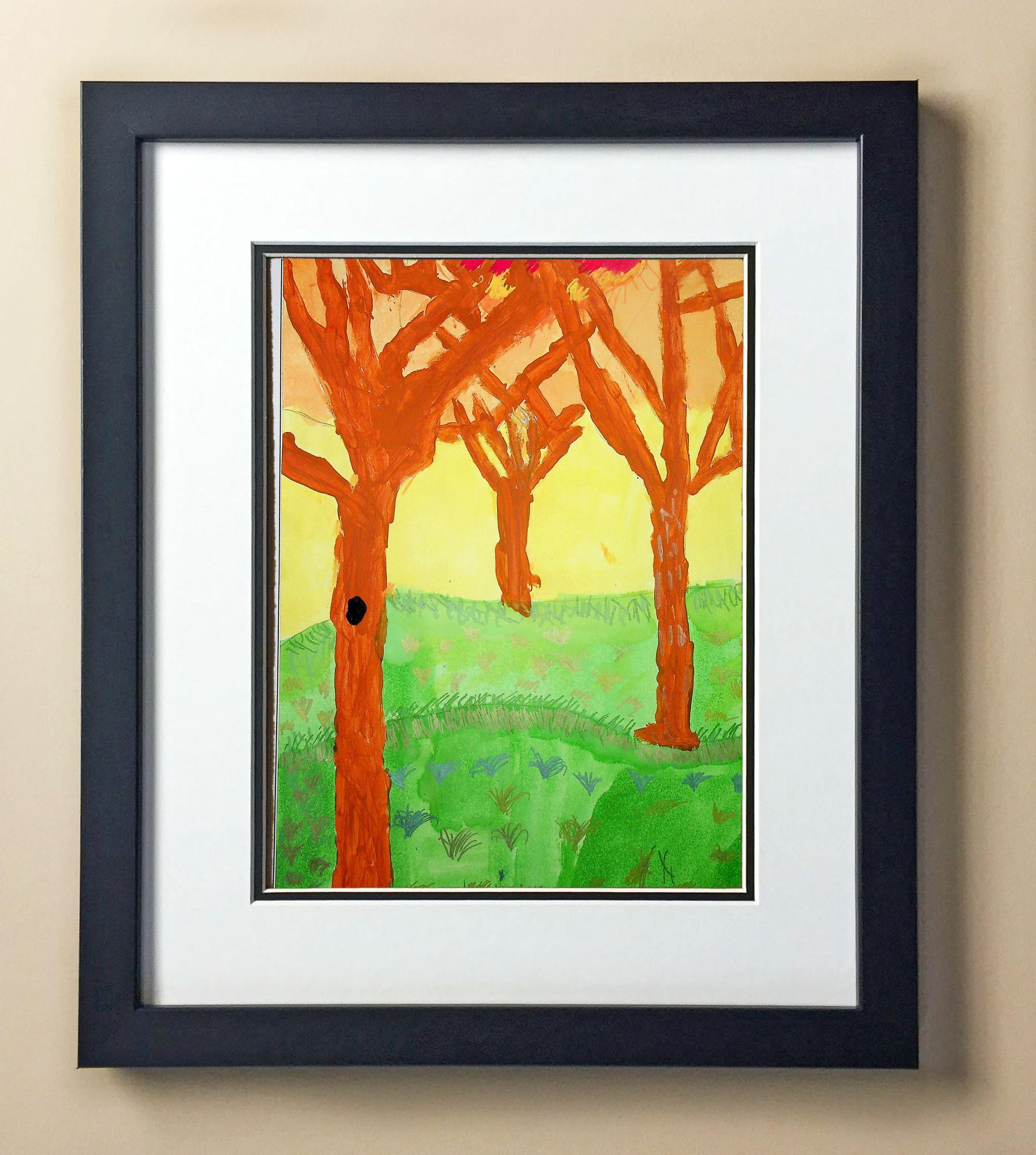 Included with the purchase is the Students Artwork, Frame, double matboard, shatter proof plexiglass, and a ready to hang backerboard with turnbuttons