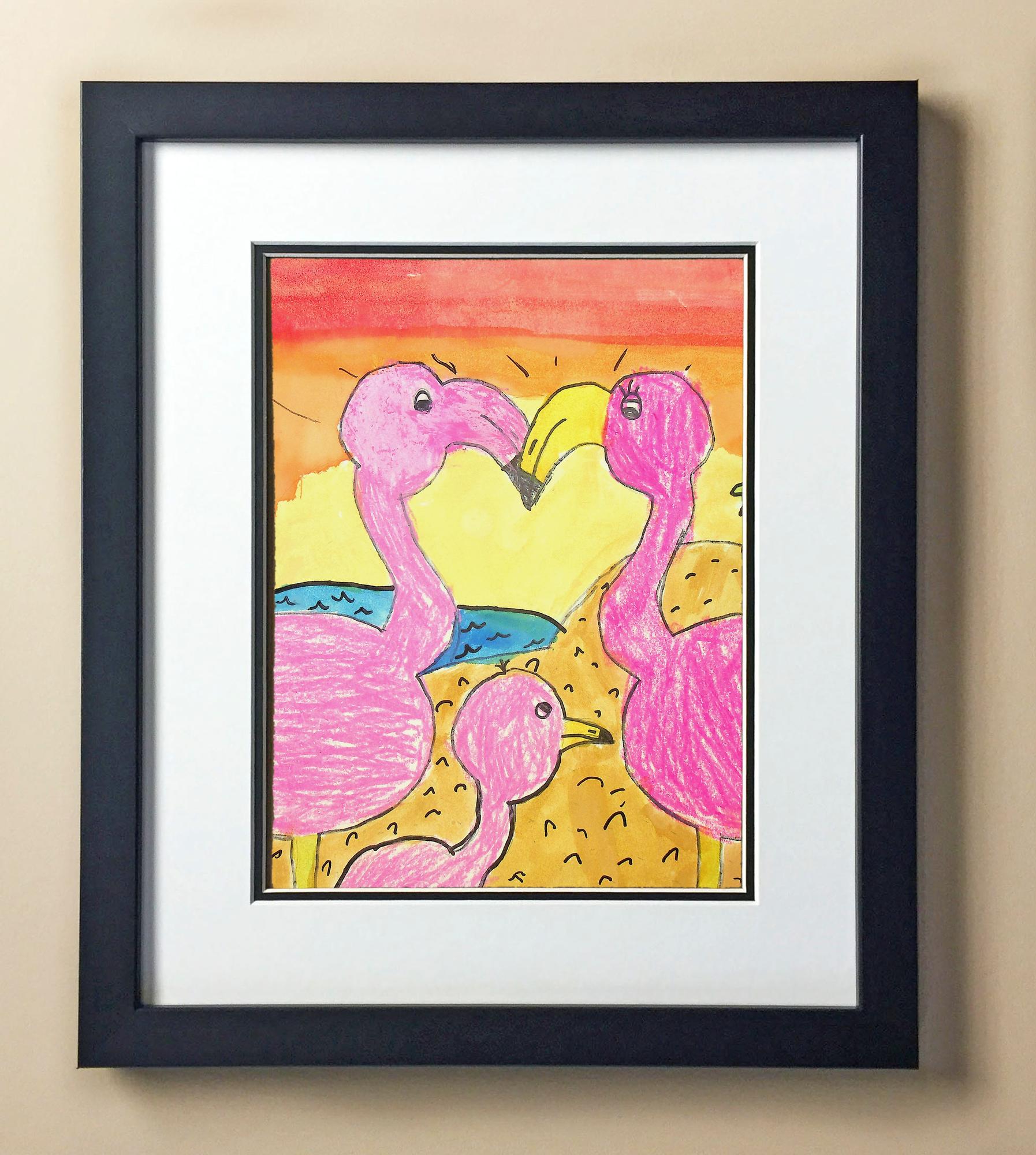 Included with the purchase is the Students Artwork, Frame, double matboard, shatter proof plexiglass, and a ready to hang backerboard with turnbuttons