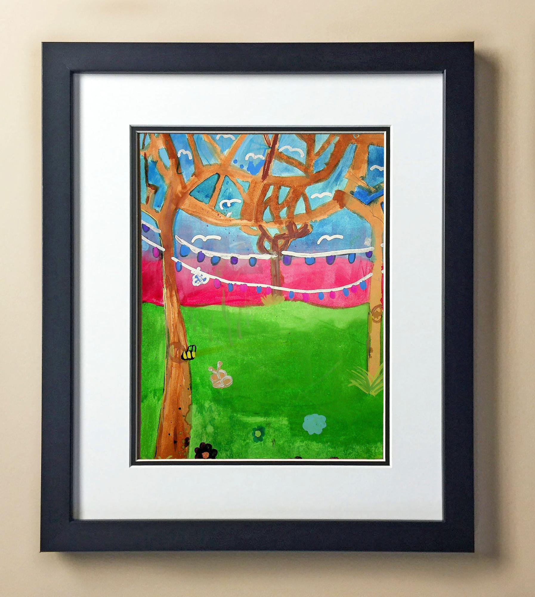 Included with the purchase is the Students Artwork, Frame, double matboard, shatter proof plexiglass, and a ready to hang backerboard with turnbuttons
