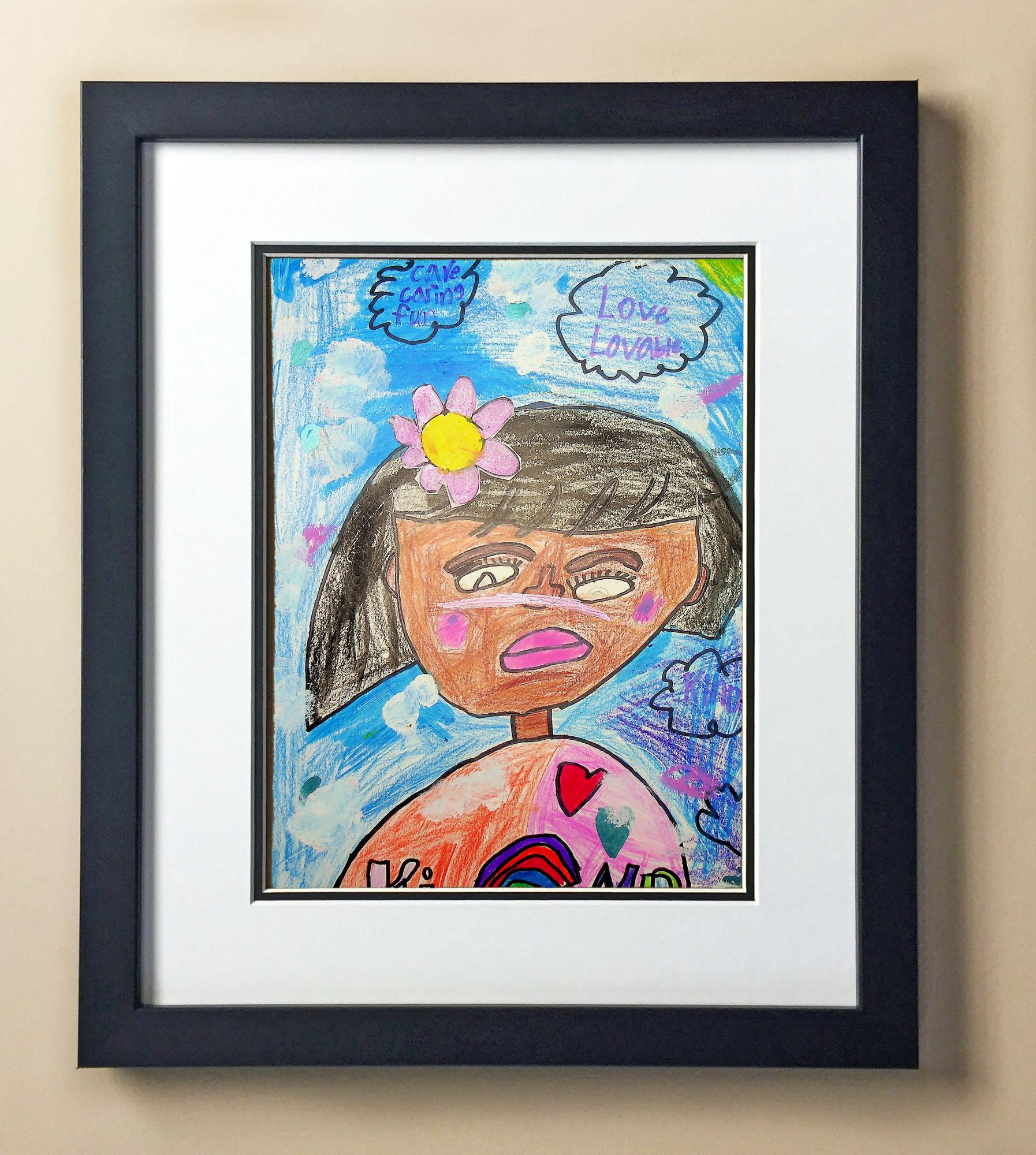 Included with the purchase is the Students Artwork, Frame, double matboard, shatter proof plexiglass, and a ready to hang backerboard with turnbuttons