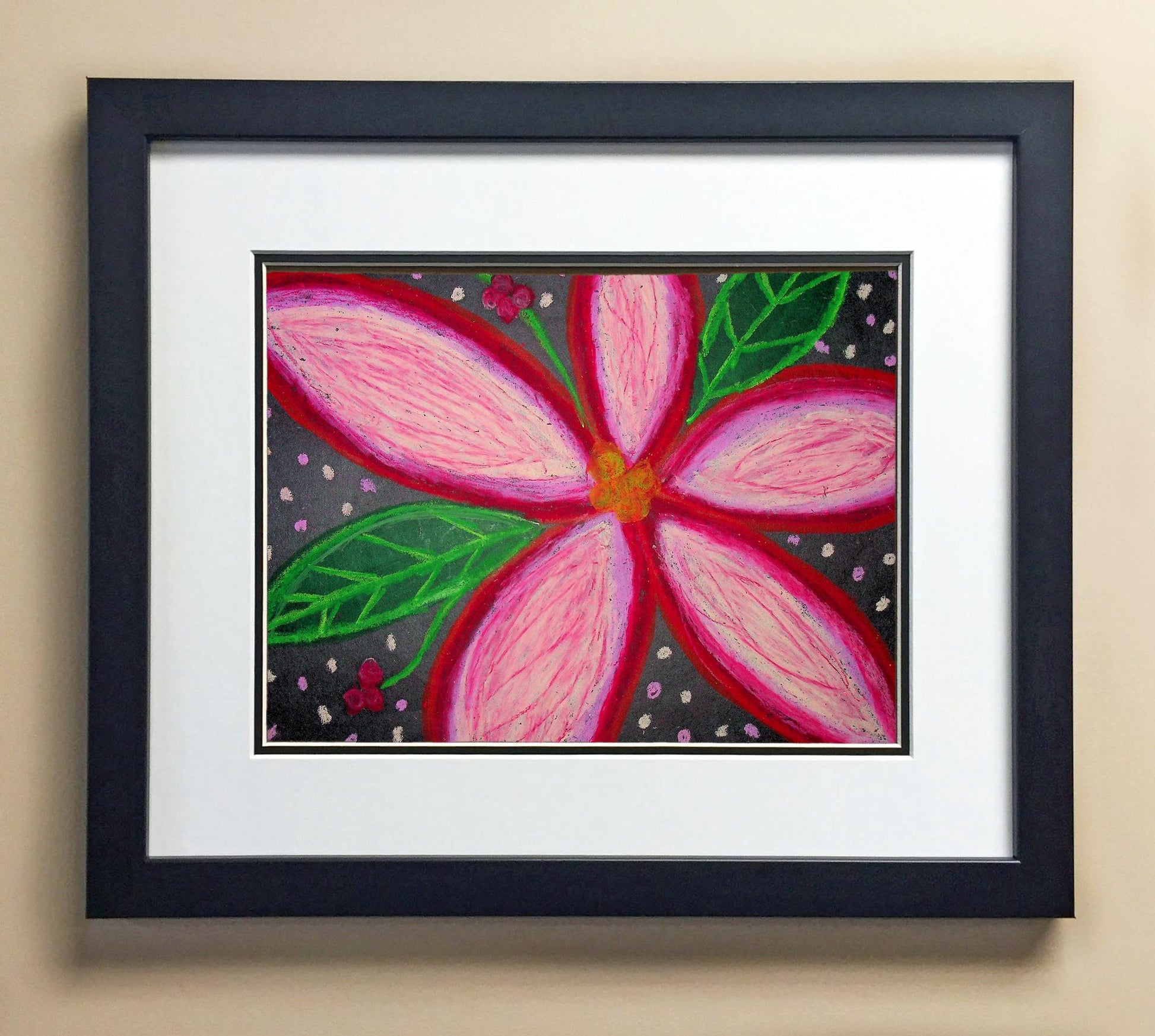Included with the purchase is the Students Artwork, Frame, double matboard, shatter proof plexiglass, and a ready to hang backerboard with turnbuttons