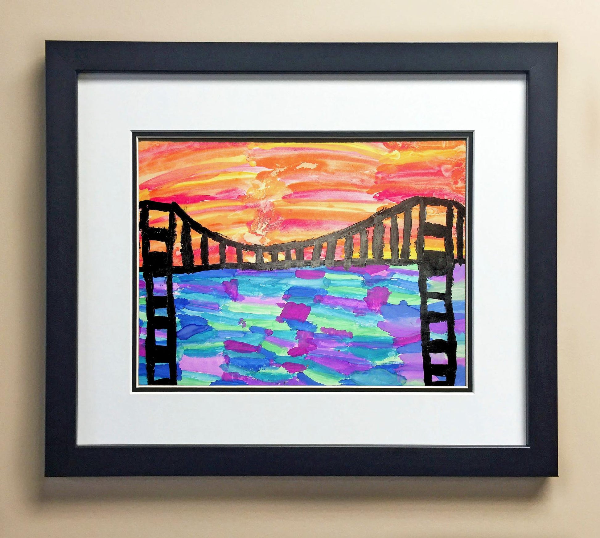 Included with the purchase is the Students Artwork, Frame, double matboard, shatter proof plexiglass, and a ready to hang backerboard with turnbuttons