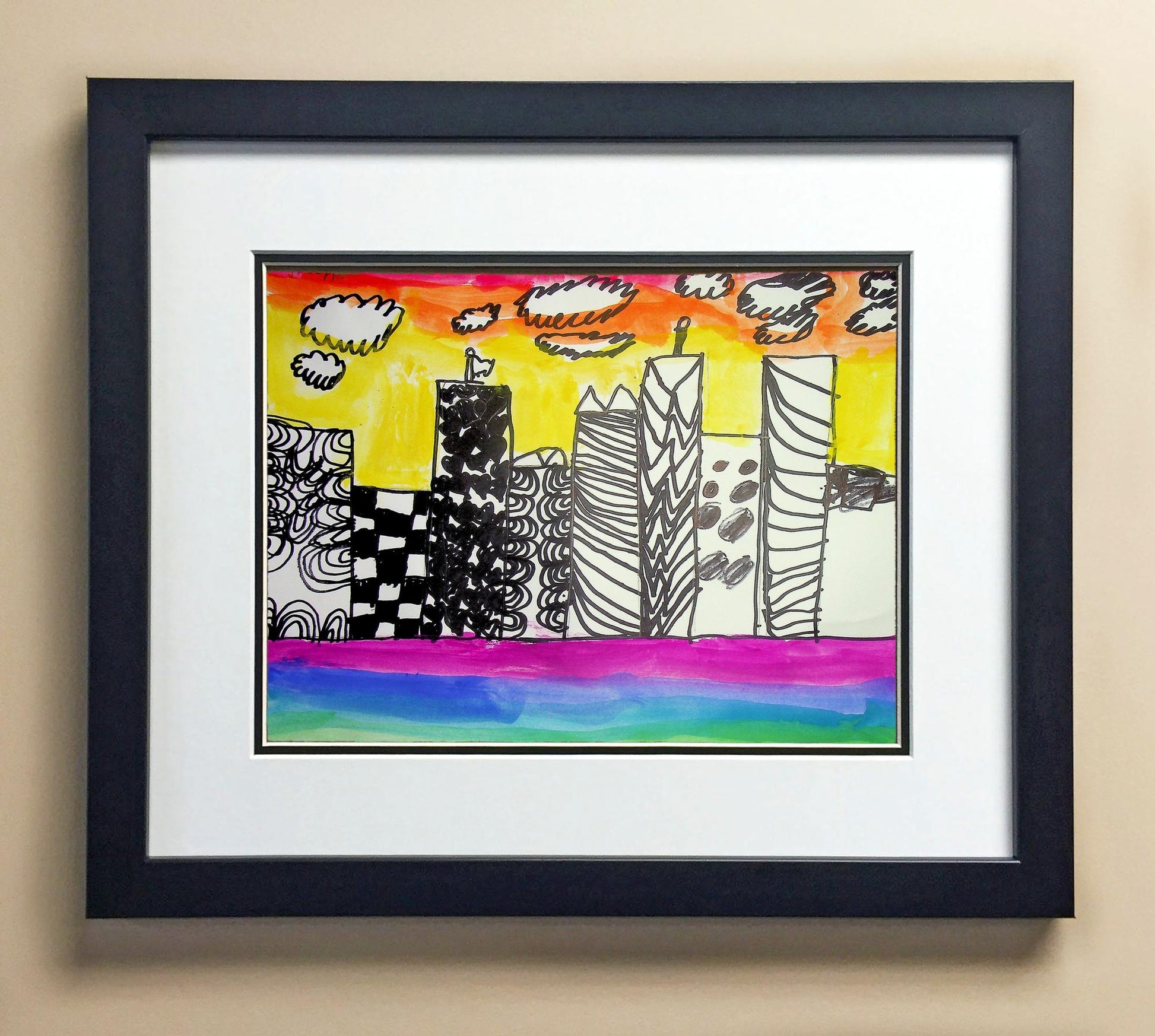 Included with the purchase is the Students Artwork, Frame, double matboard, shatter proof plexiglass, and a ready to hang backerboard with turnbuttons