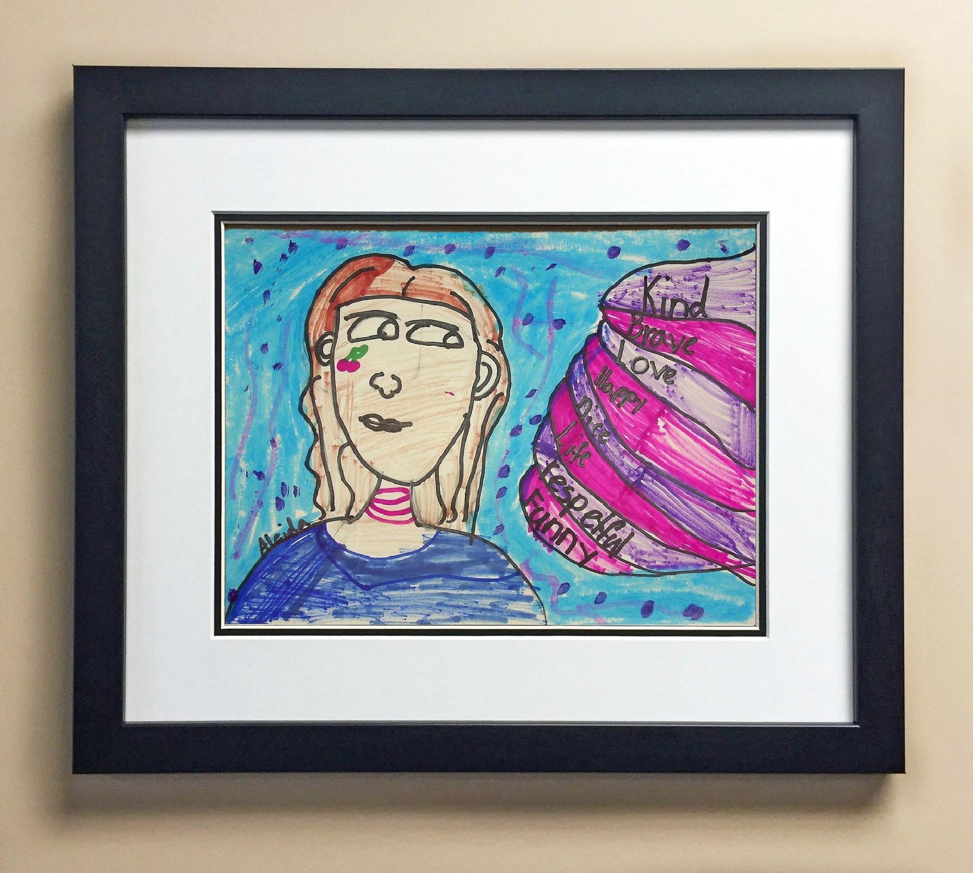 Included with the purchase is the Students Artwork, Frame, double matboard, shatter proof plexiglass, and a ready to hang backerboard with turnbuttons