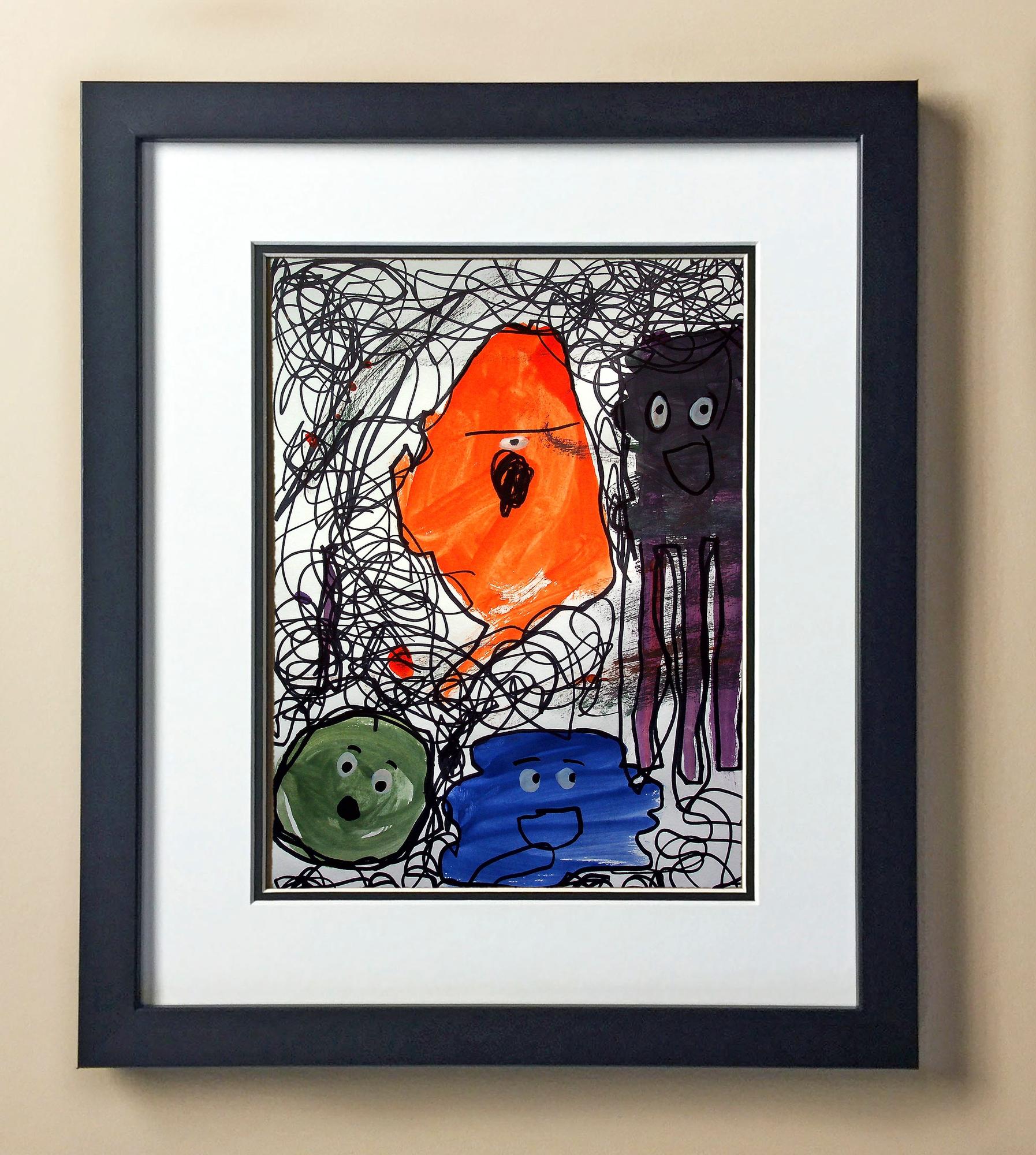 Included with the purchase is the Students Artwork, Frame, double matboard, shatter proof plexiglass, and a ready to hang backerboard with turnbuttons