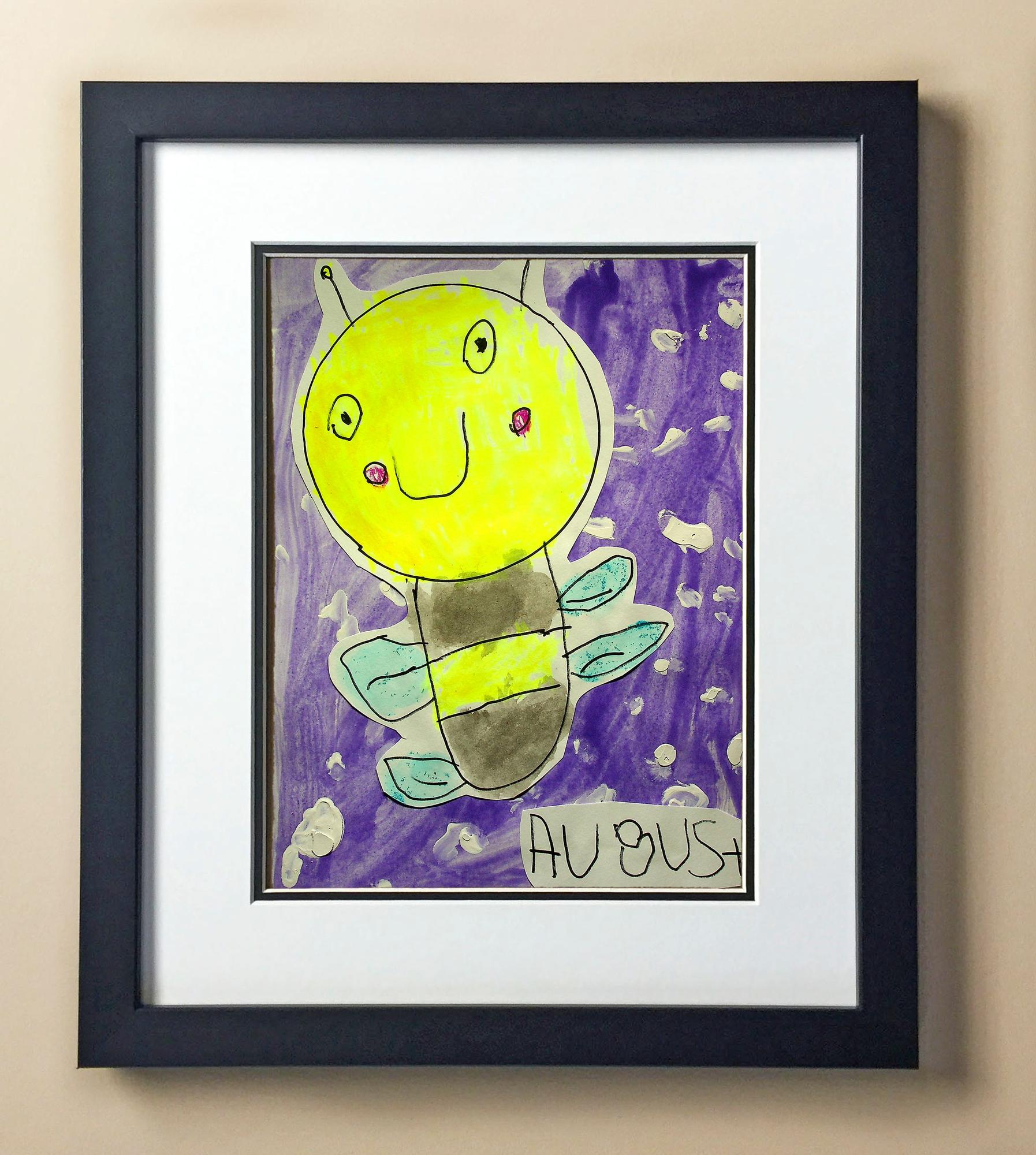 Included with the purchase is the Students Artwork, Frame, double matboard, shatter proof plexiglass, and a ready to hang backerboard with turnbuttons