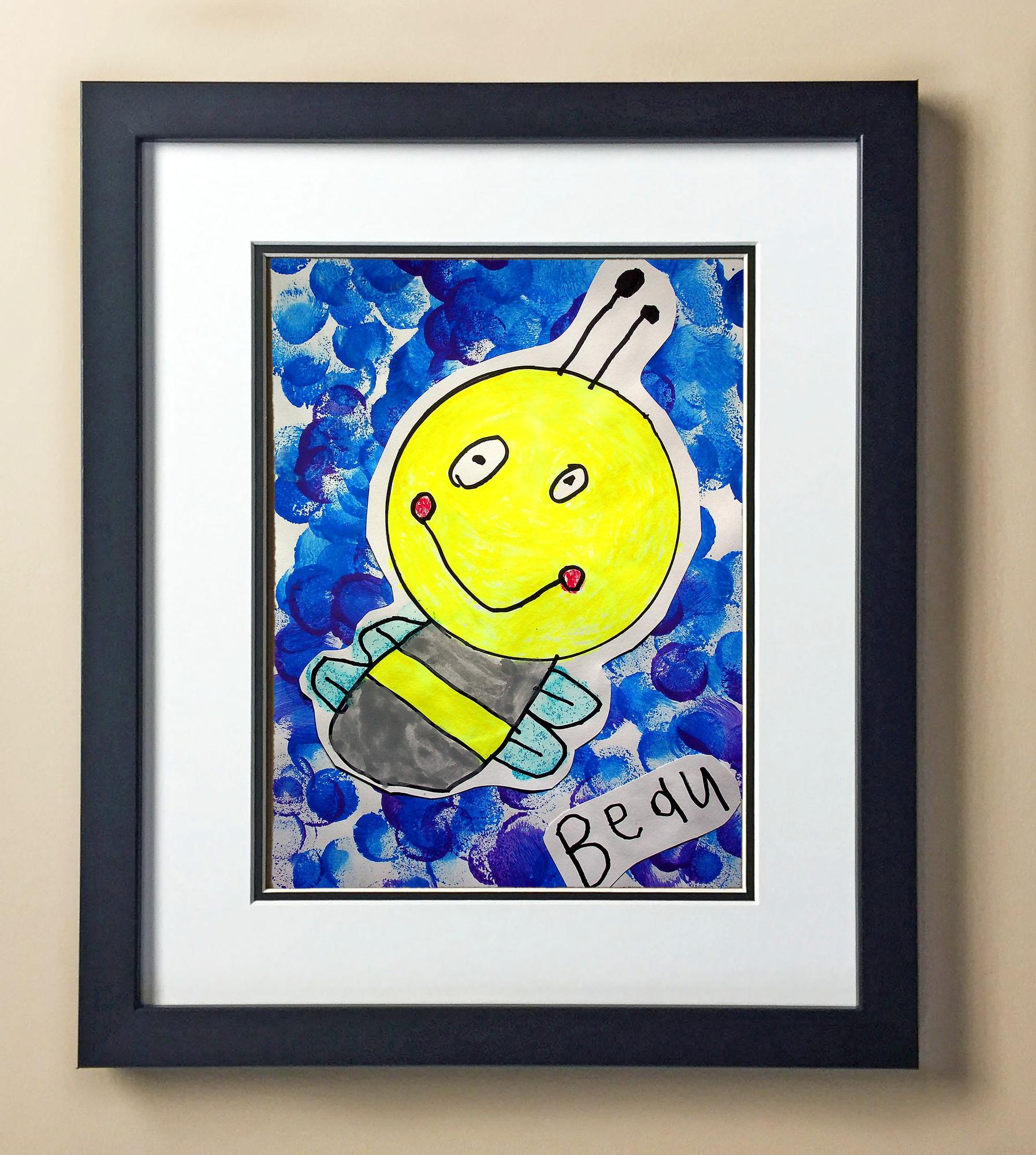 Included with the purchase is the Students Artwork, Frame, double matboard, shatter proof plexiglass, and a ready to hang backerboard with turnbuttons