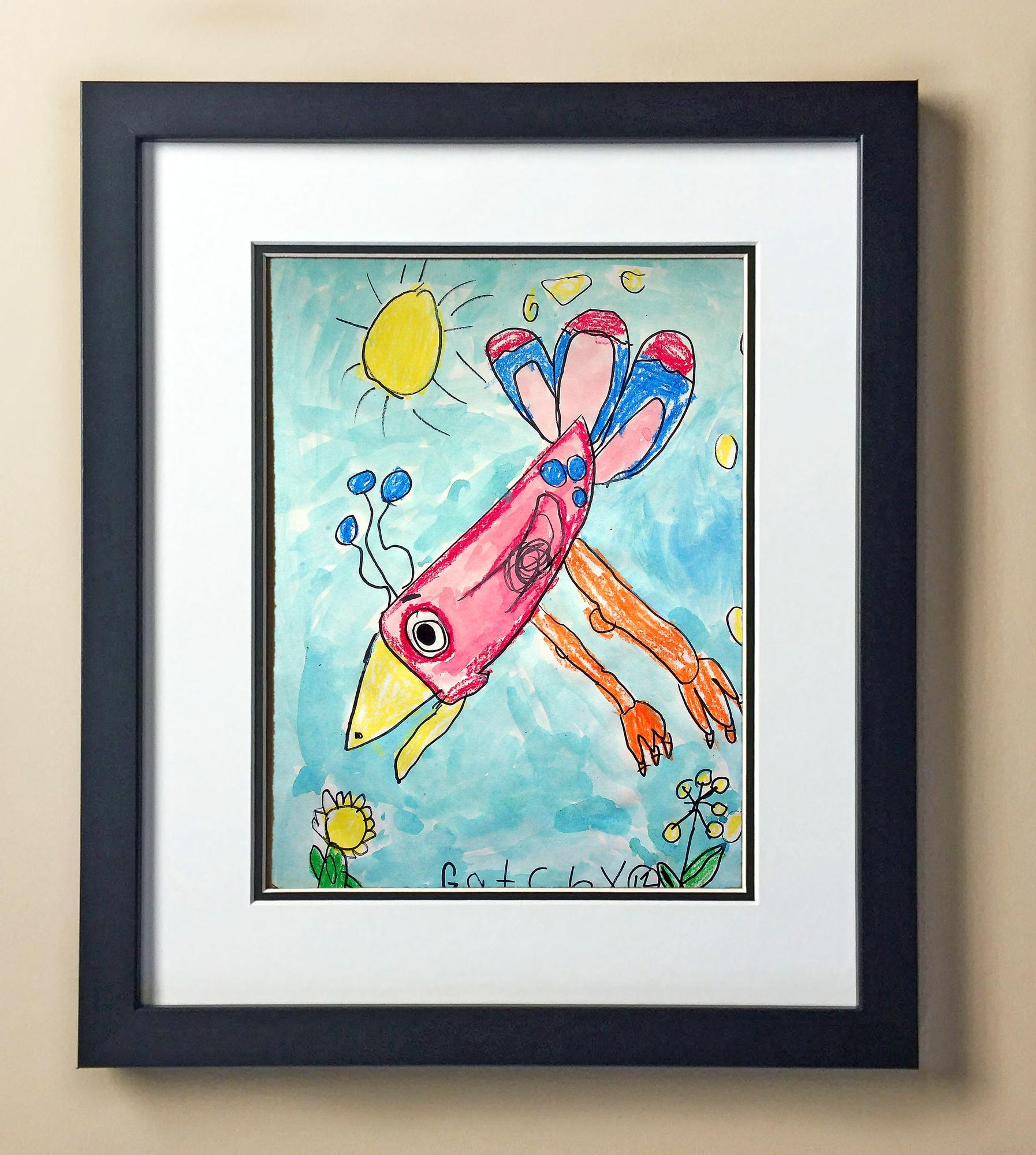 Included with the purchase is the Students Artwork, Frame, double matboard, shatter proof plexiglass, and a ready to hang backerboard with turnbuttons