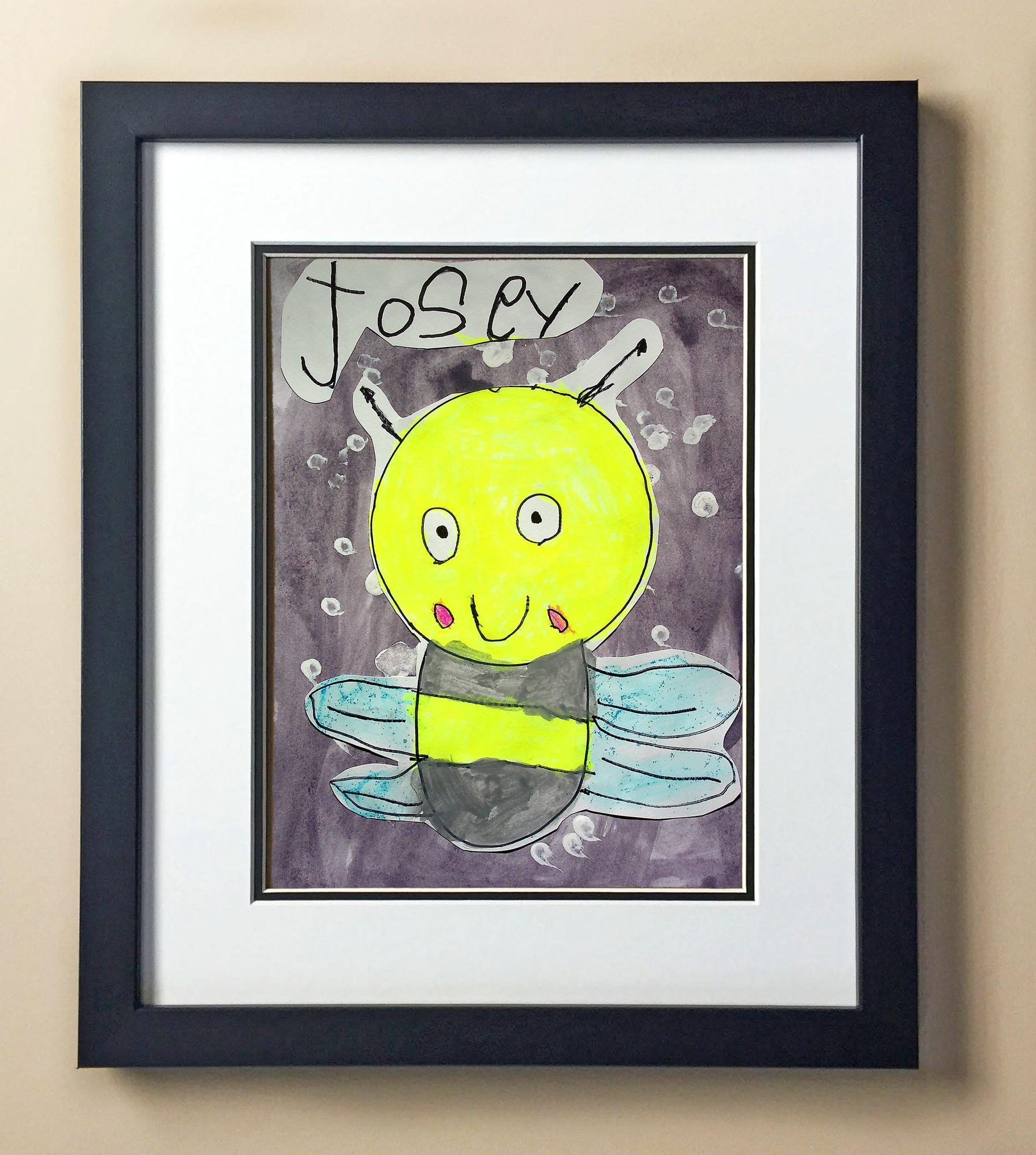 Included with the purchase is the Students Artwork, Frame, double matboard, shatter proof plexiglass, and a ready to hang backerboard with turnbuttons