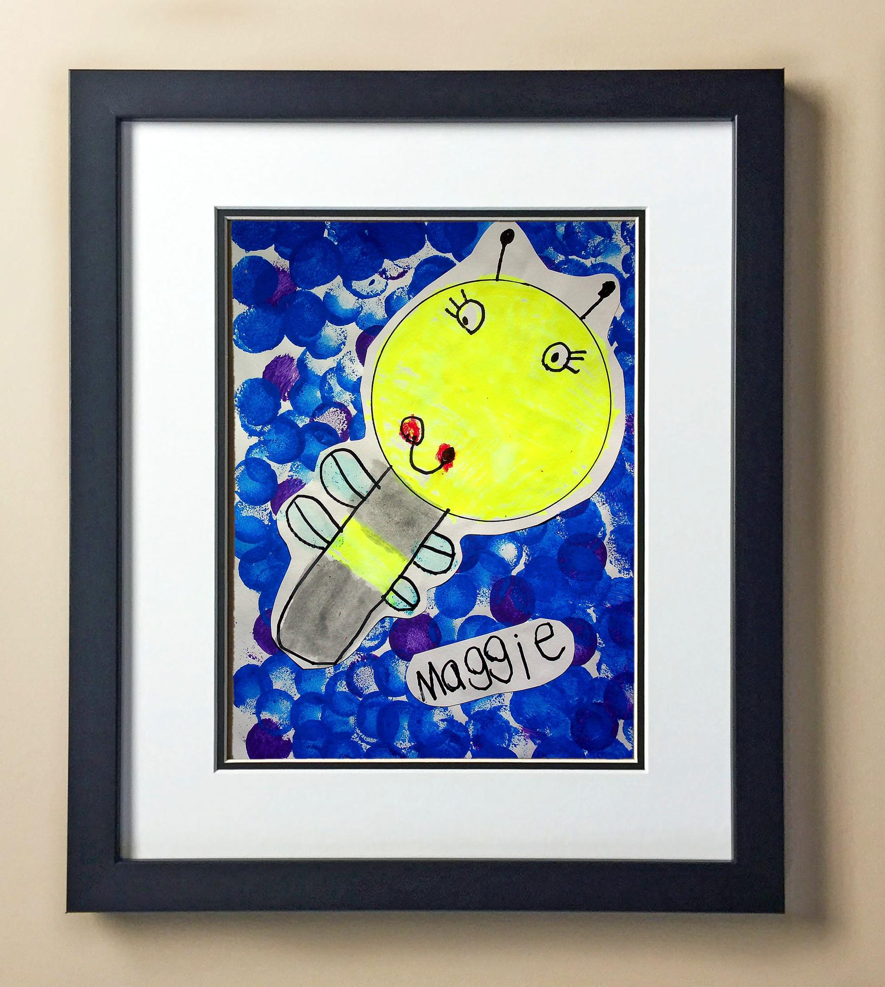 Included with the purchase is the Students Artwork, Frame, double matboard, shatter proof plexiglass, and a ready to hang backerboard with turnbuttons