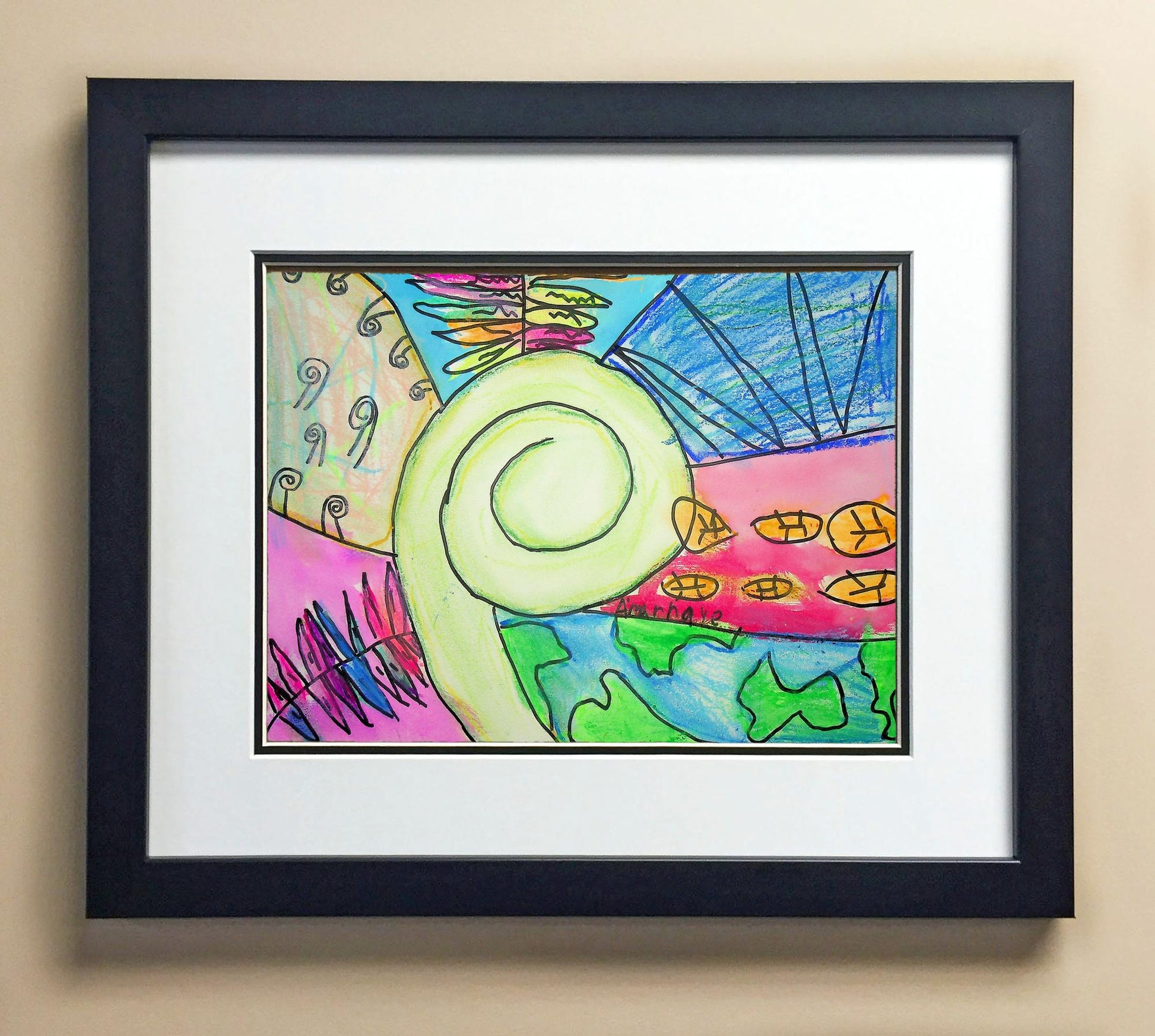 Included with the purchase is the Students Artwork, Frame, double matboard, shatter proof plexiglass, and a ready to hang backerboard with turnbuttons