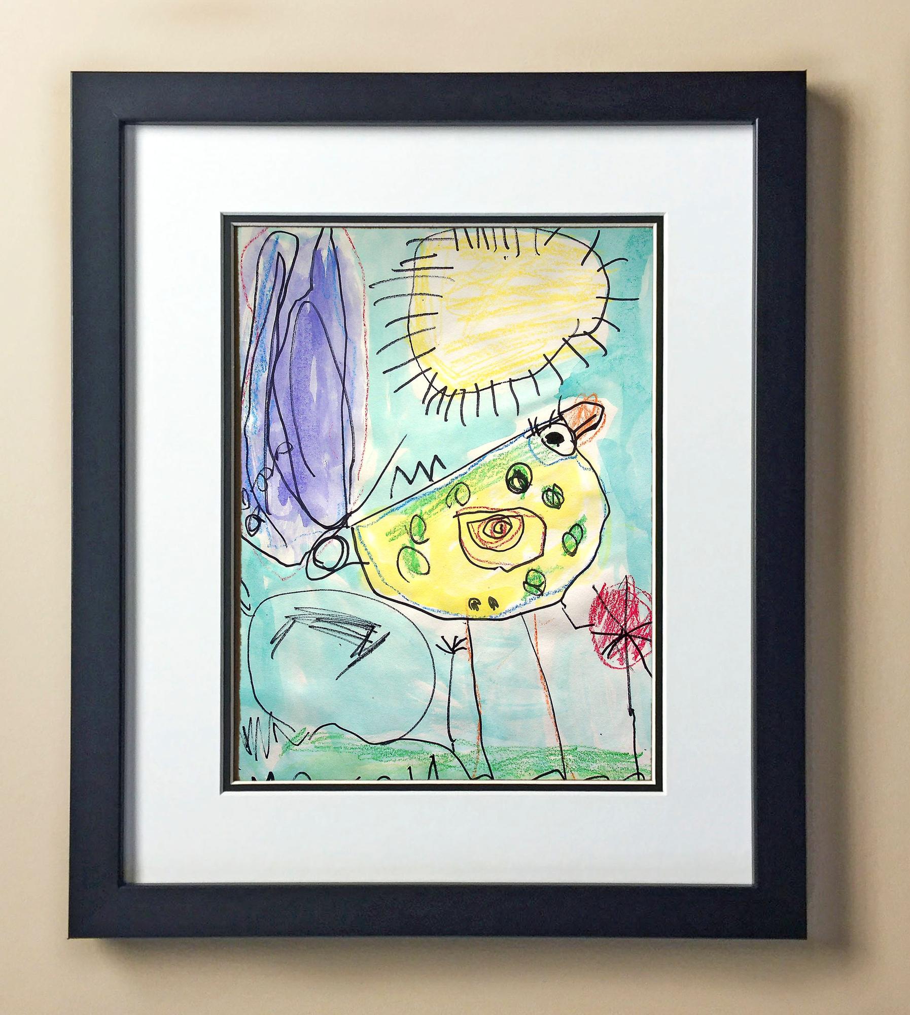 Included with the purchase is the Students Artwork, Frame, double matboard, shatter proof plexiglass, and a ready to hang backerboard with turnbuttons