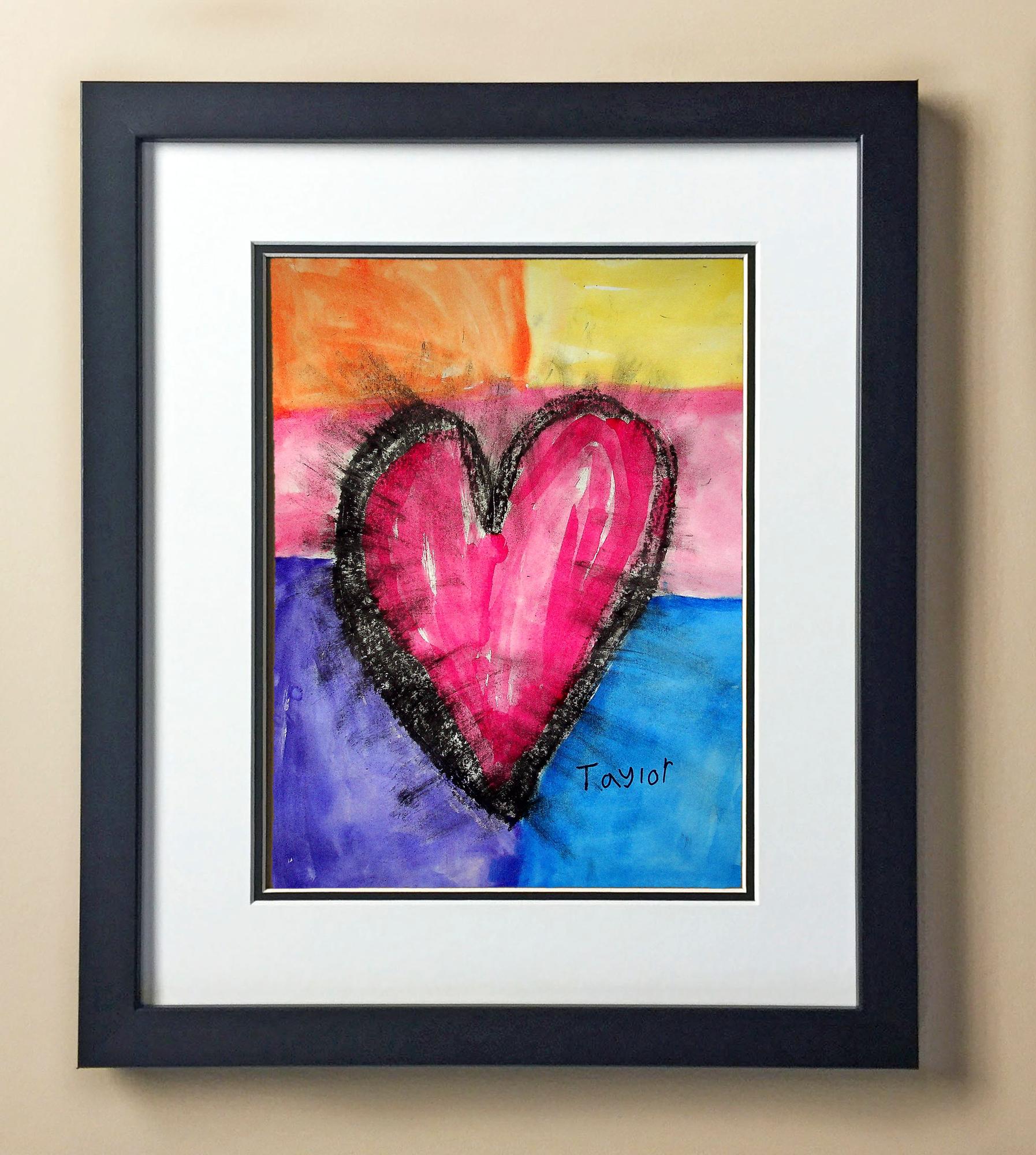Included with the purchase is the Students Artwork, Frame, double matboard, shatter proof plexiglass, and a ready to hang backerboard with turnbuttons