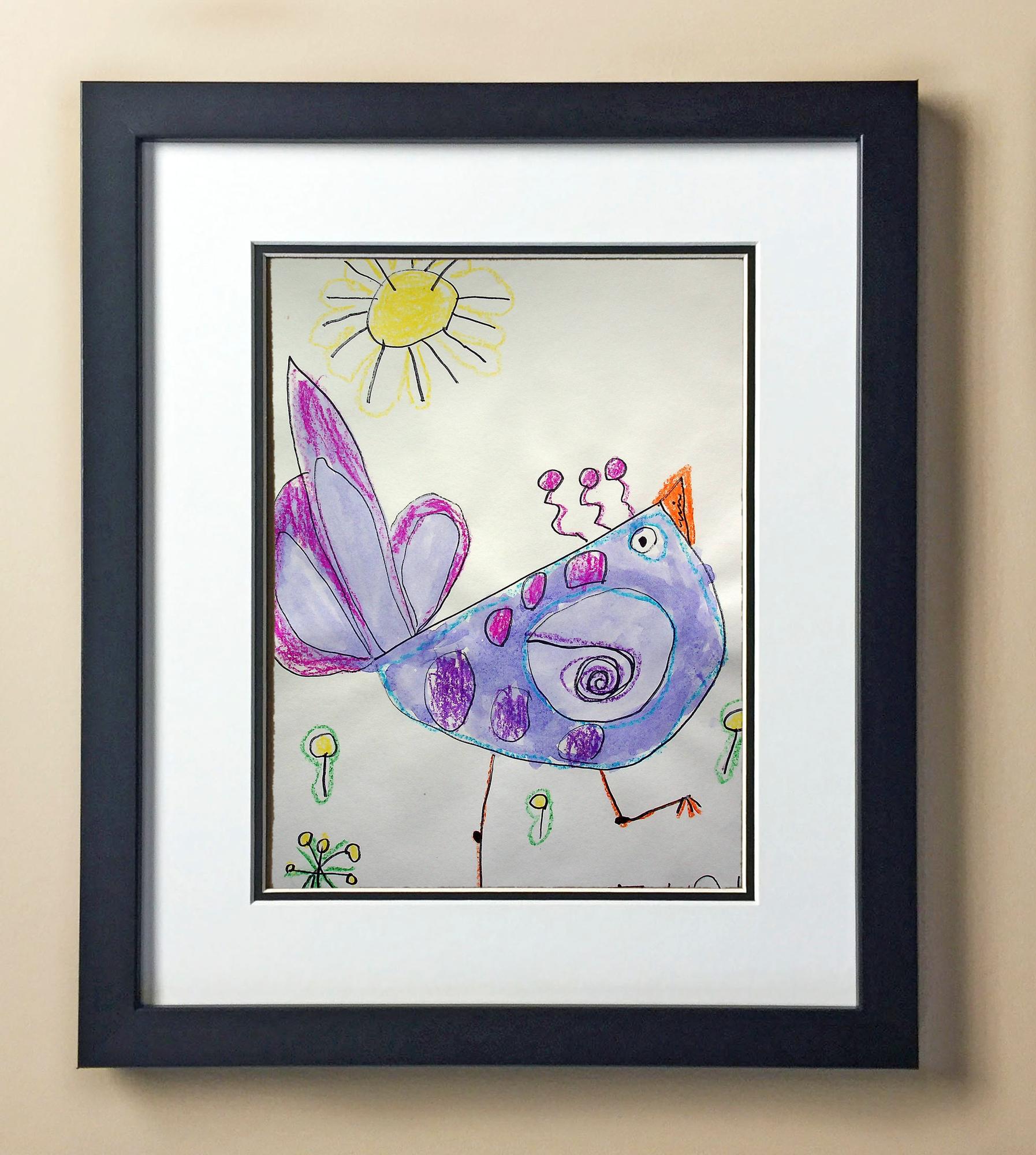 Included with the purchase is the Students Artwork, Frame, double matboard, shatter proof plexiglass, and a ready to hang backerboard with turnbuttons
